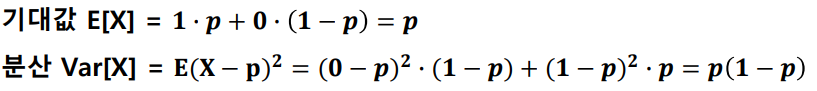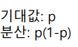 - 베르누이 분포의 평균: P, 분산: p(1-p)