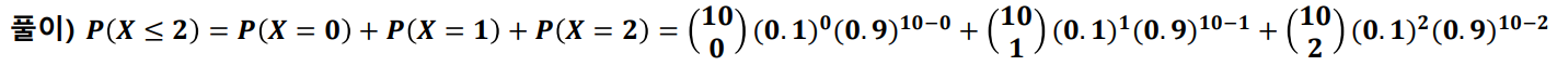 예제4.2) 반도체 공장에서 불량이 발생할 확률이 10%라고 하자. 10개의 제품을 생성했을때 불량이 2개 이하일 확률을 구하시오