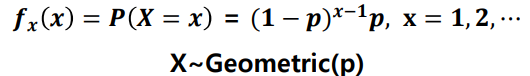 | 기하분포 | 어떤 실험에서 처음 성공이 발생하기까지 시도한 횟수 X의 분포 | ![]() |