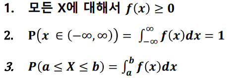 연속형 확률 변수 X에 대해서 함수 f(x)가 아래의 조건을 만족하면 확률밀도함수라고 함