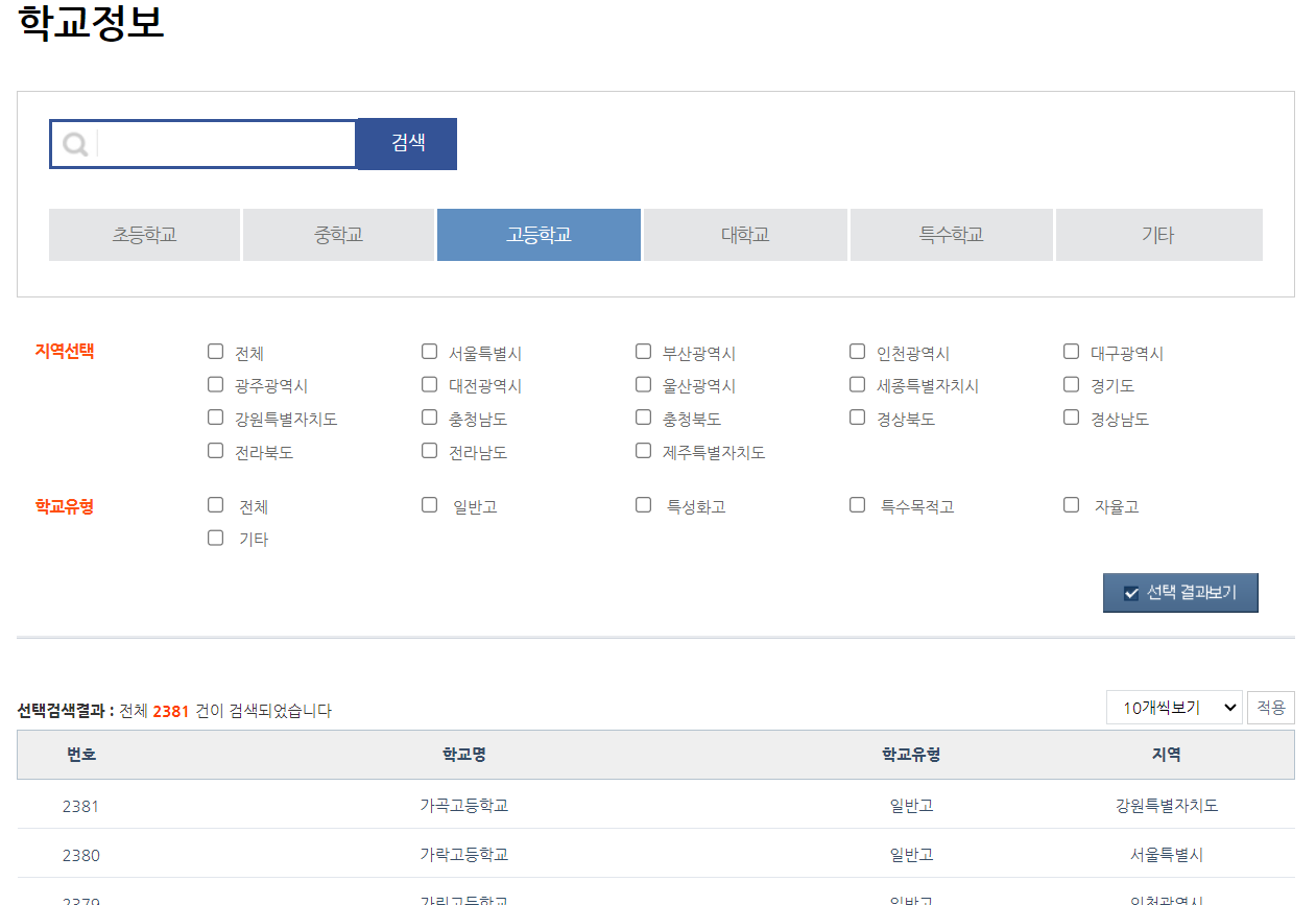 일단 전국 고등학교들이 나와 있는 사이트를 찾아봤습니다.