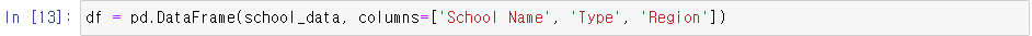 'columns' 인자는 DataFrame의 각 열에 대한 제목을 지정합니다. 저는 'School Name', 'Type', 'Region'으로 설정하였습니다.