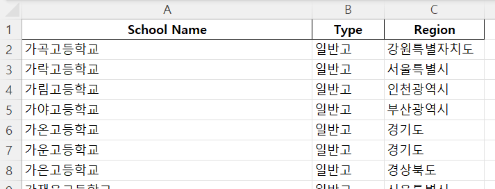 [WebData][Schools]전국 고등학교 목록/엑셀 본문