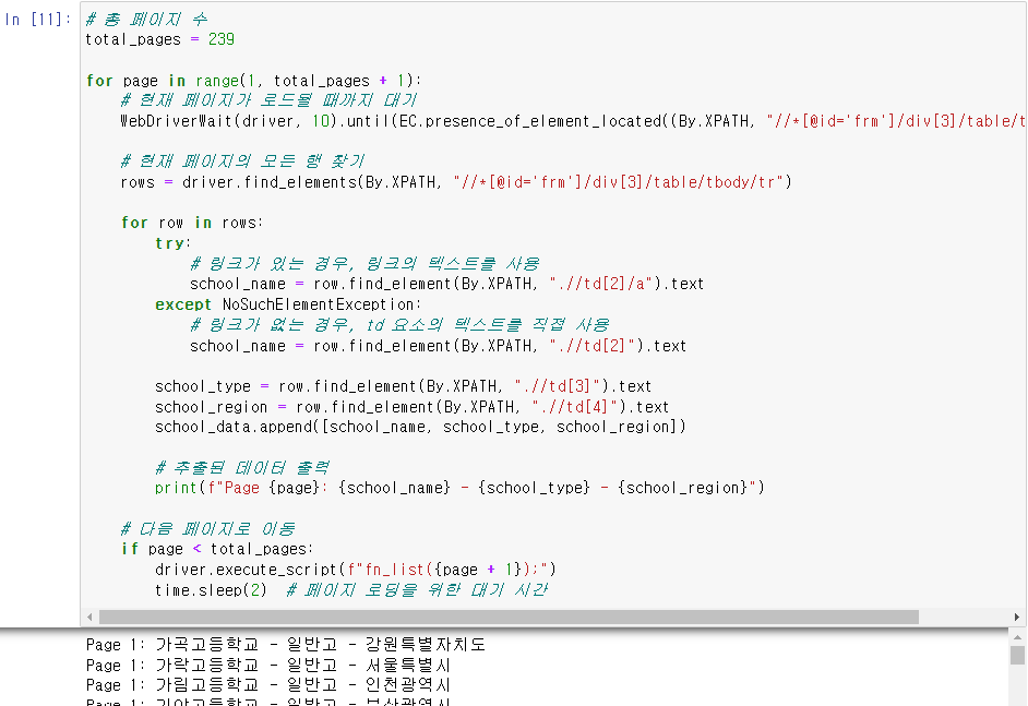 여기서 'school_data'는 웹 크롤링을 통해 수집된 학교 이름, 유형, 지역 정보를 담고 있는 리스트입니다.