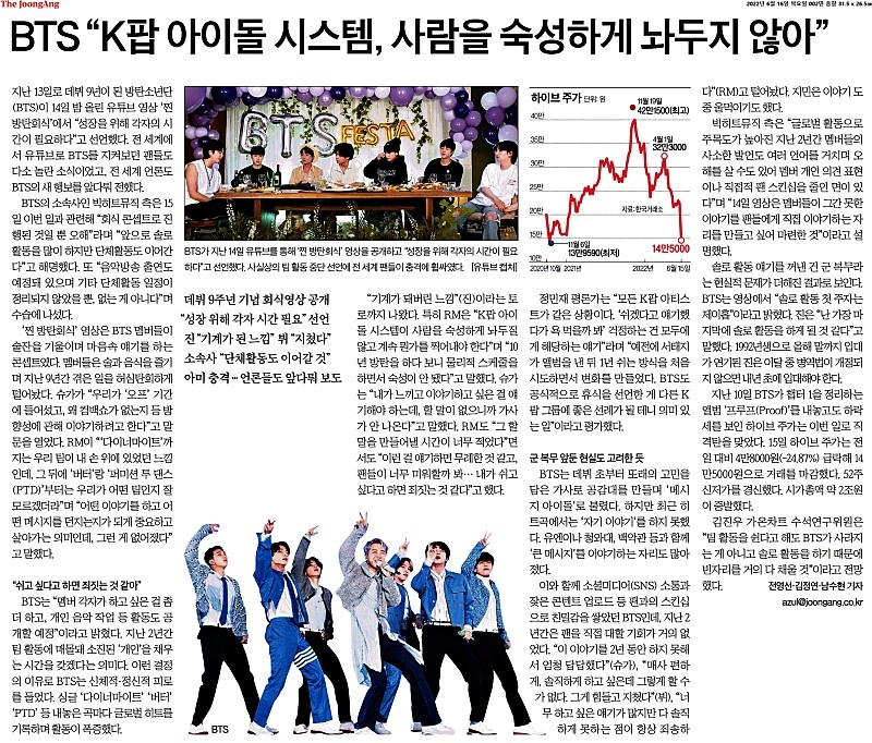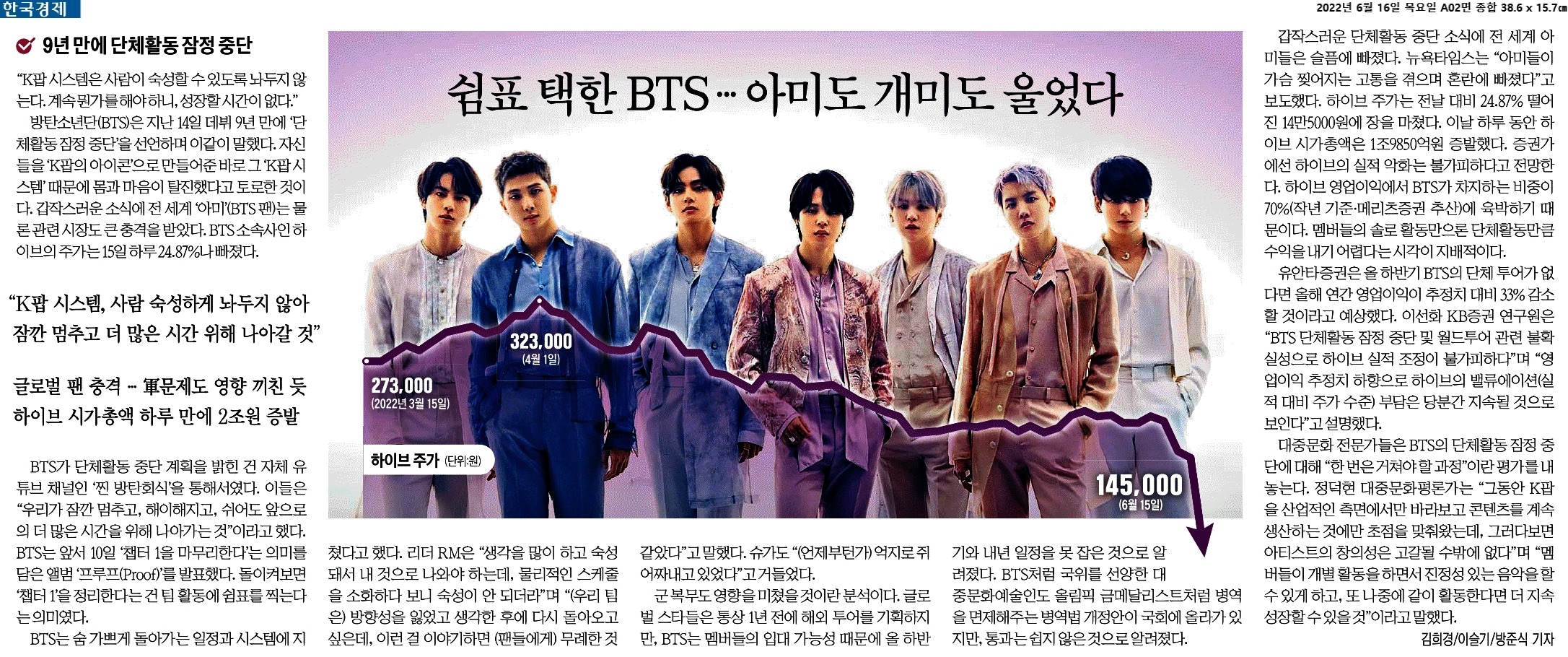 데뷔 9년 만에 '쉼표' 택한 BTS…아미도 개미도 울었다, 9년 만에 단체활동 잠정 중단 "K팝 시스템, 사람 숙성하게 놔두지 않아 잠깐 멈추고 더 많은 시간 위해 나아갈 것" 글로벌 팬 충격…軍문제