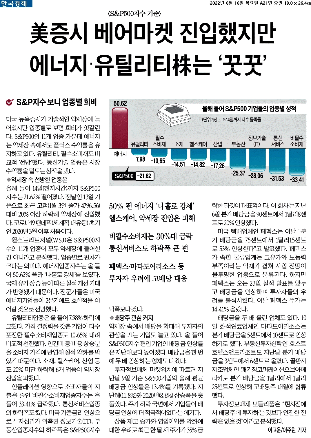美증시 베어마켓 진입했지만…에너지·유틸리티株는 '꿋꿋', S&P지수 보니 업종별 희비 50% 뛴 에너지 '나홀로 강세' 헬스케어, 약세장 진입은 피해 비필수소비재는 30%대 급락 통신서비스도 하락