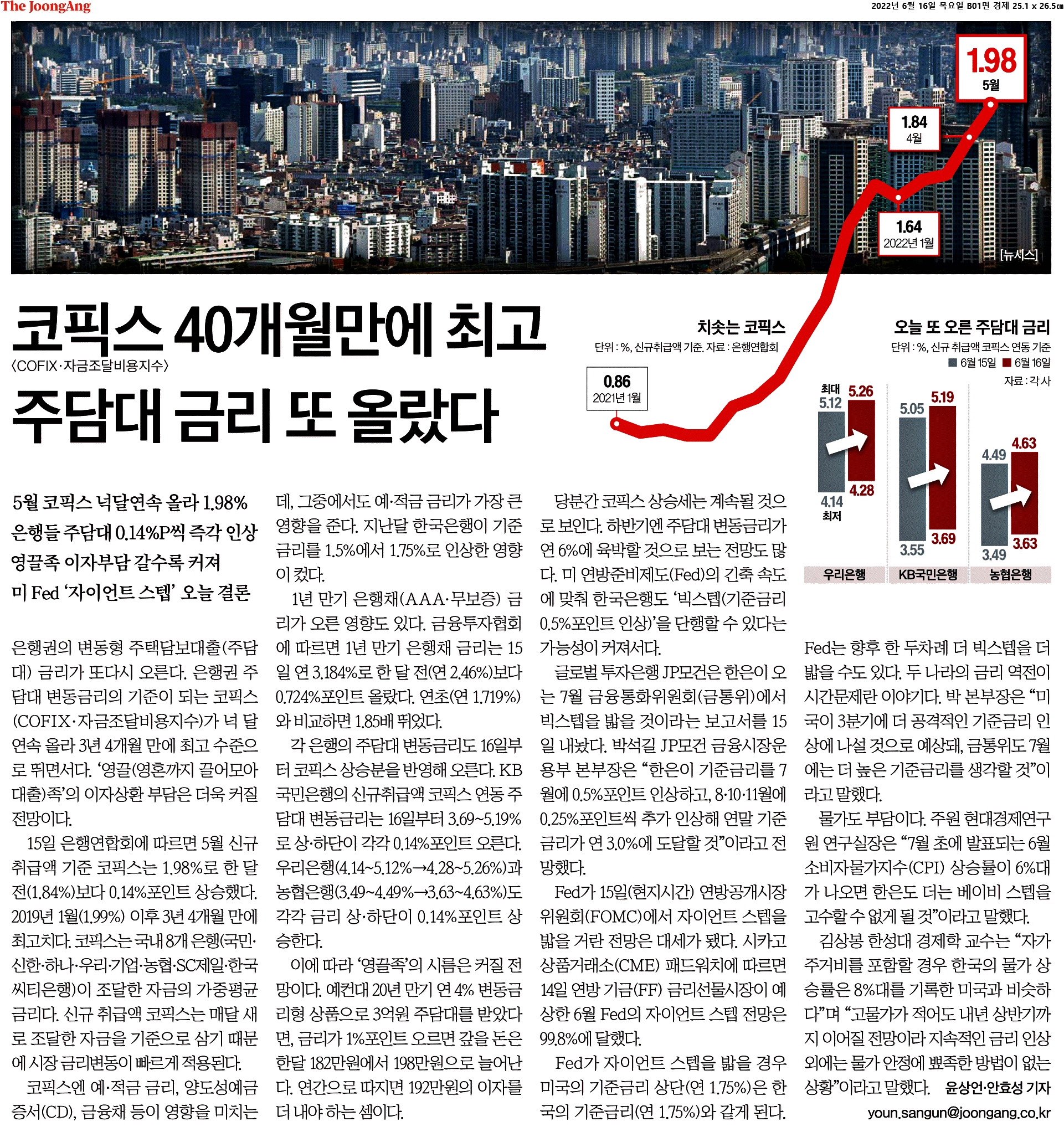 은행권 주담대 변동금리의 기준이 되는 코픽스(COFIX·자금조달비용지수)가 넉 달 연속 올라 3년 4개월 만에 최고 수준으로 뛰면서다. 15일 은행연합회에 따르면 5월 신규취급액 기준 코픽스는 1.98%