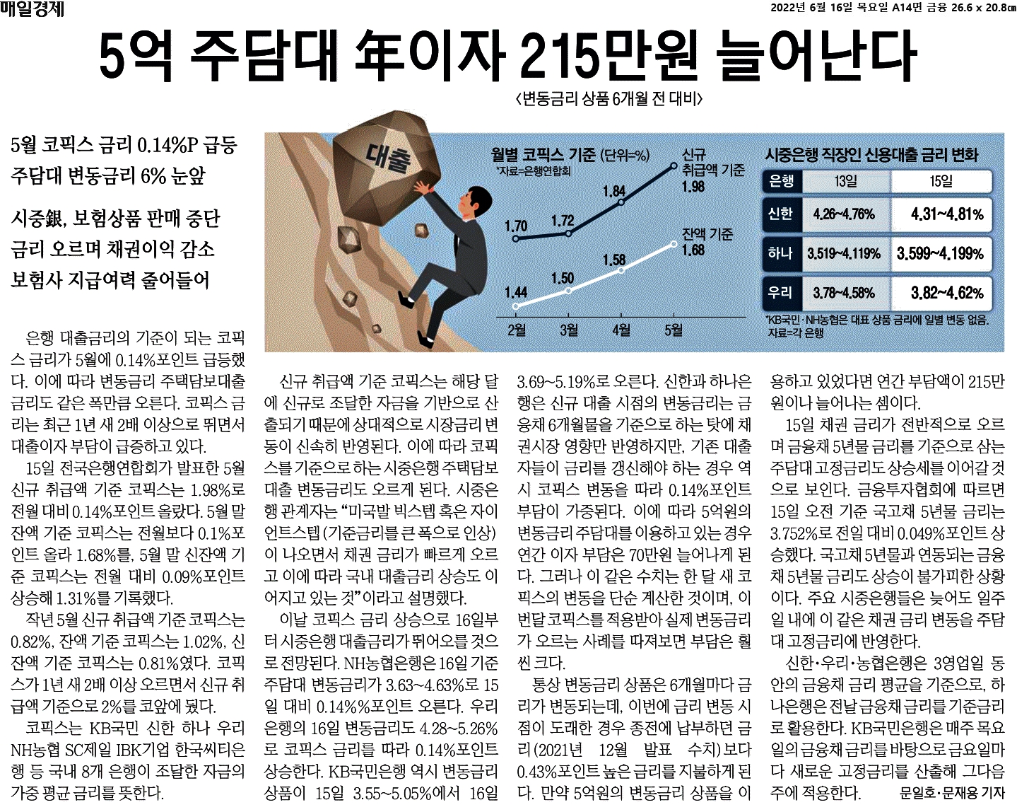 5월 코픽스 금리 0.14%P 급등 주담대 변동금리 6% 눈앞 시중銀, 보험상품 판매 중단 금리 오르며 채권이익 감소 보험사 지급여력 줄어들어