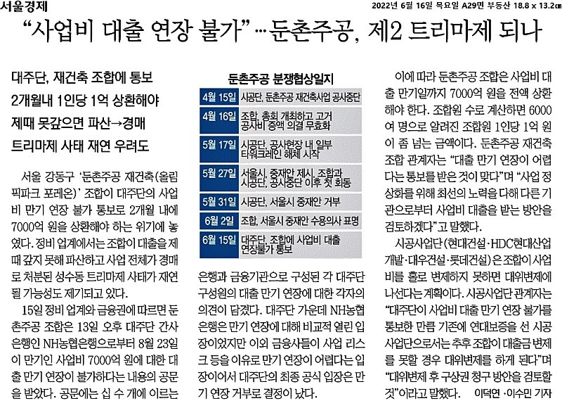 '7000억원 대출 연장 불가' 둔촌주공 재건축 날벼락…조합원 부담 눈덩이↑