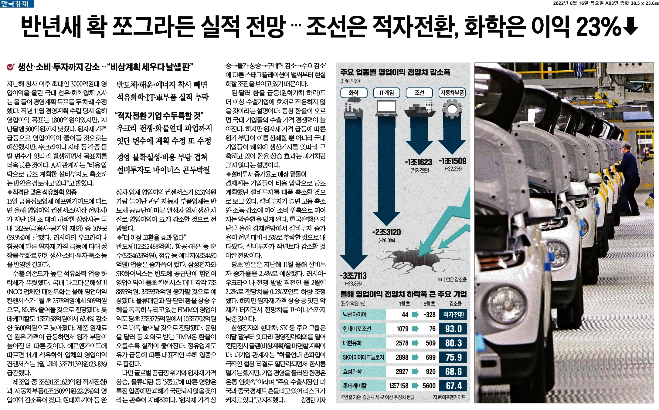 반년새 확 쪼그라든 실적 전망…조선은 적자전환, 화학은 이익 23%↓, 생산·소비·투자까지 감소 "비상계획 세우다 날샐 판" 반도체·해운·에너지 착시 빼면 석유화학·IT·車부품 실적 추락 "적자