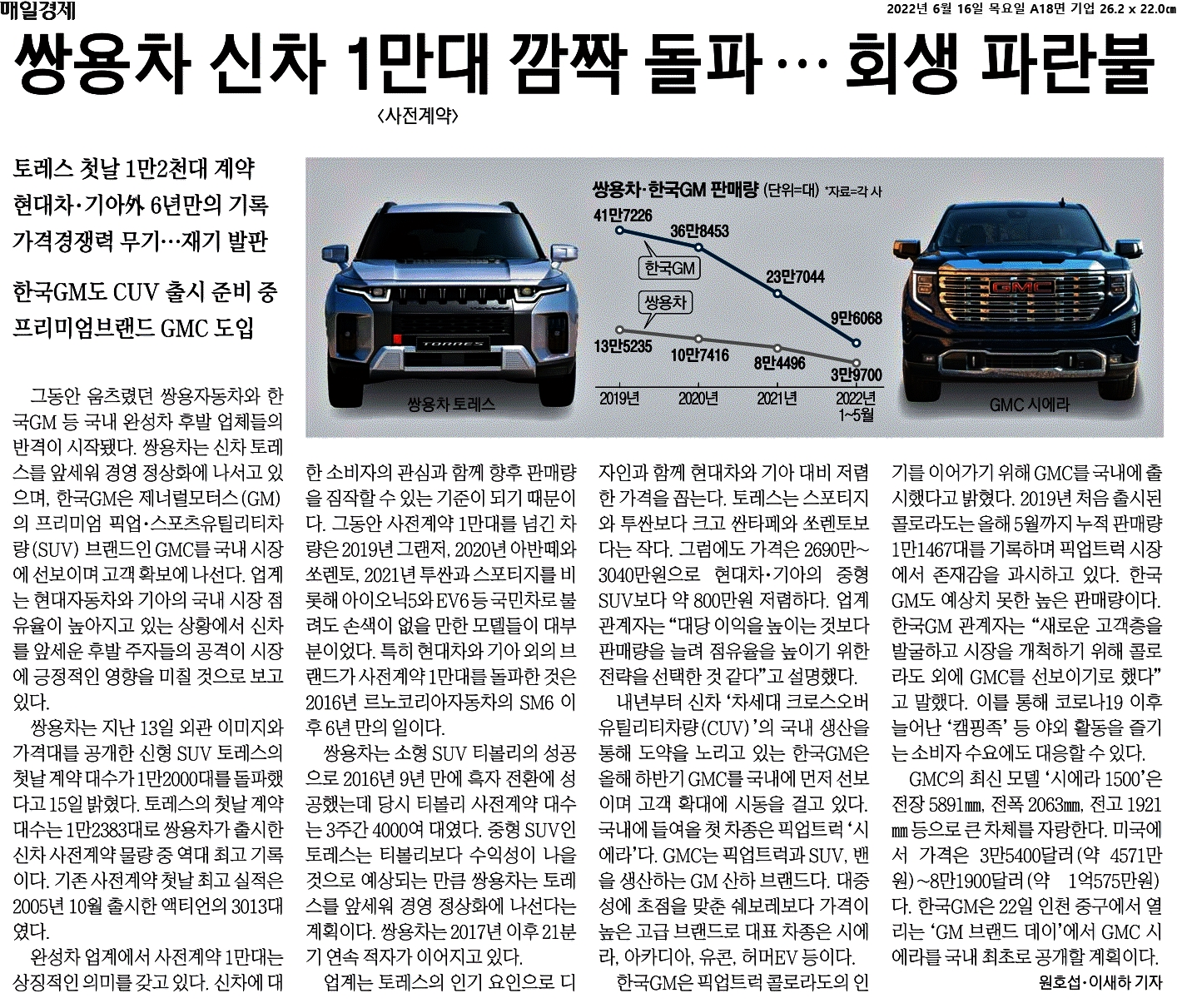 토레스 첫날 1만2천대 계약 현대차·기아外 6년만의 기록 가격경쟁력 무기…재기 발판 한국GM도 CUV 출시 준비 중 프리미엄브랜드 GMC 도입