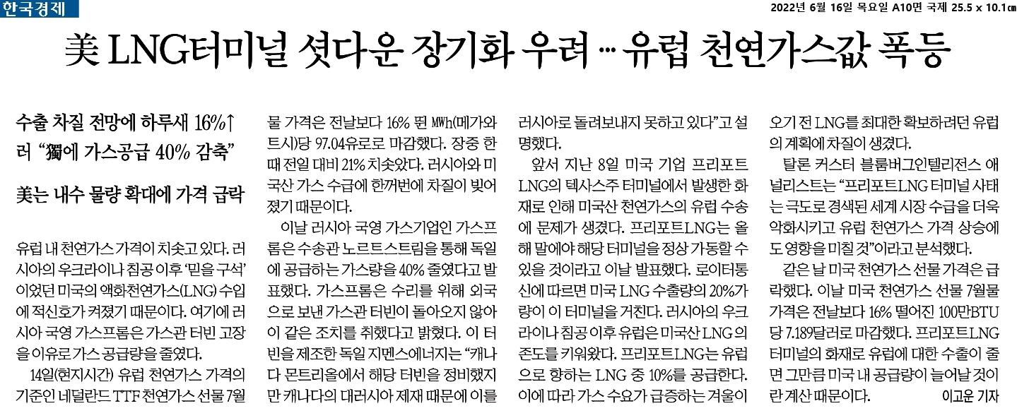 美 LNG터미널 셧다운 장기화 우려…유럽 천연가스값 폭등, 수출 차질 전망에 하루새 16%↑ 러 "獨에 가스공급 40% 감축" 美는 내수 물량 확대에 가격 급락