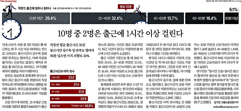통근시간이 20분 미만인 근로자의 직장만족도는 3.62(5점 만점)로 측정된 반면, 90분 이상인 근로자의 직장만족도는 3.28에 그쳤다. 통근시간이 20~40분인 근로자는 20분 미만인 근로자보다 이직의향