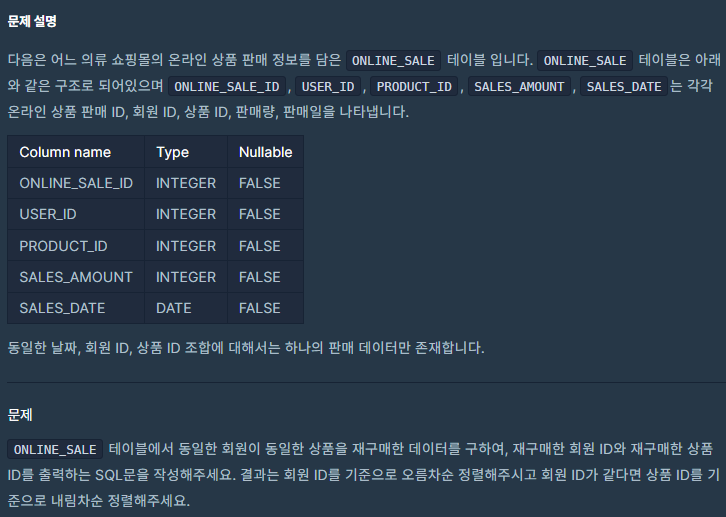 [프로그래머스] 재구매가 일어난 상품과 회원 리스트 구하기 Lv.2 본문