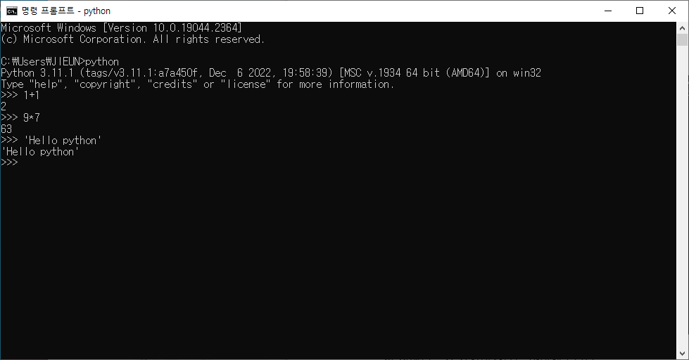 " >>> "이 나오면 python 프로그램이 실행되었다고 알 수 있습니다.