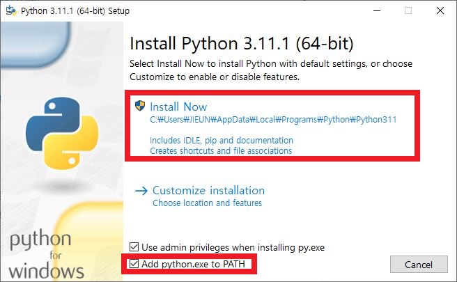 3. Add python.exe to PATH 체크 후 Install Now을 진행합니다.