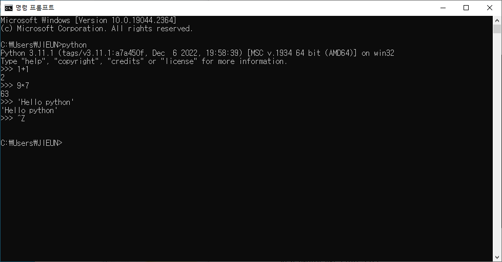 Ctrl + Z 를 입력하여 python을 빠져 나올 수 있습니다.