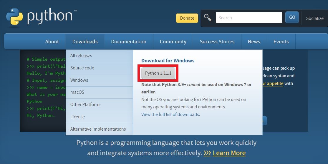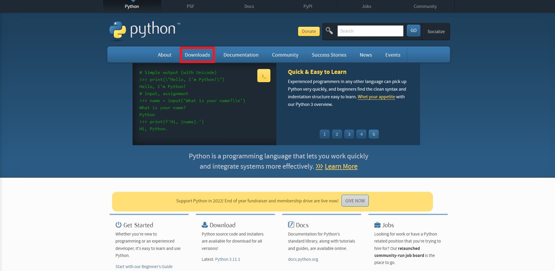 2. Downloads를 누르면 최신버전의 파이썬을 다운로드 받을 수 있습니다.
