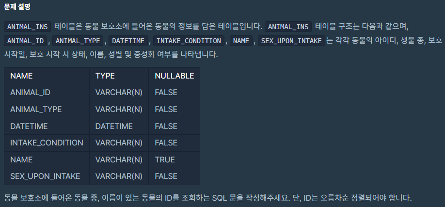 [프로그래머스] 이름이 있는 동물의 아이디 Lv.1 본문